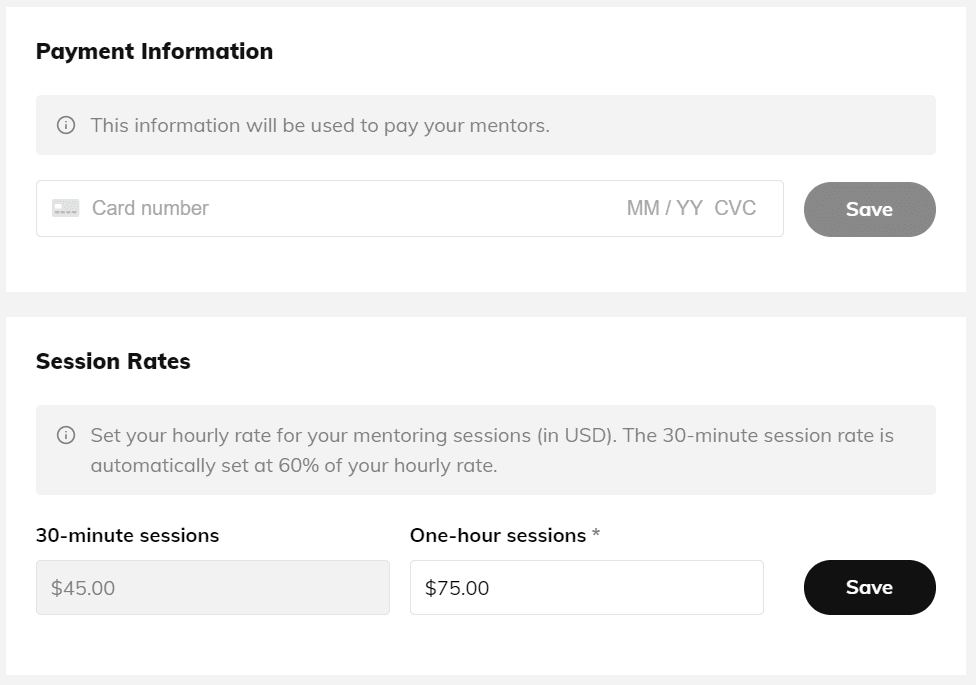 En tant que mentor.e, vous pouvez également réserver avec d'autres mentor.e.s. C'est ici que vous pouvez mettre à jour vos informations de paiement pour assurer le paiement des mentor.e.s avec lesquels vous réservez.