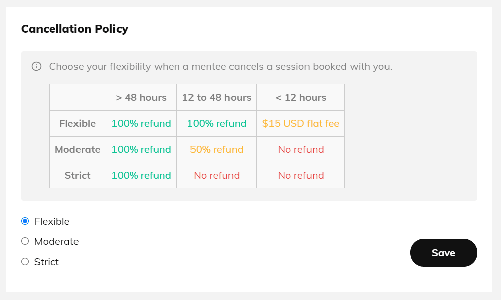 Dans l'onglet « Paiements », vous pouvez sélectionner vos préférences en matière de politique d'annulation. Choisissez entre des politiques souples, modérées et strictes pour les cas où votre mentoré.e doit annuler une séance avec vous.