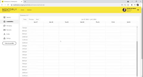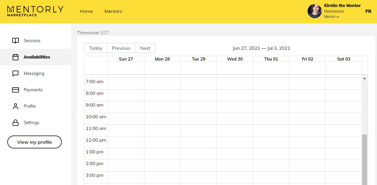 Depuis votre tableau de bord personnel, cliquez sur l'onglet « Disponibilités » sur le côté gauche. Cela vous amènera à votre calendrier Mentorly. Vous pouvez utiliser les boutons « précédent » ou « suivant » pour passer d'une semaine à l'autre. Votre fuseau horaire sera indiqué dans le coin supérieur gauche.